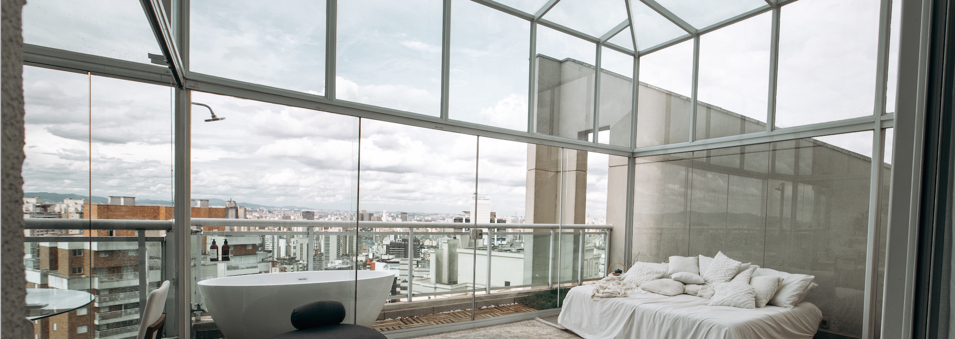 Um loft praticamente sem paredes, com dois grandes comodos, envoltos por vidro que se abrem totalmente, transformando tudo em um espaço aberto e cheio de ar.