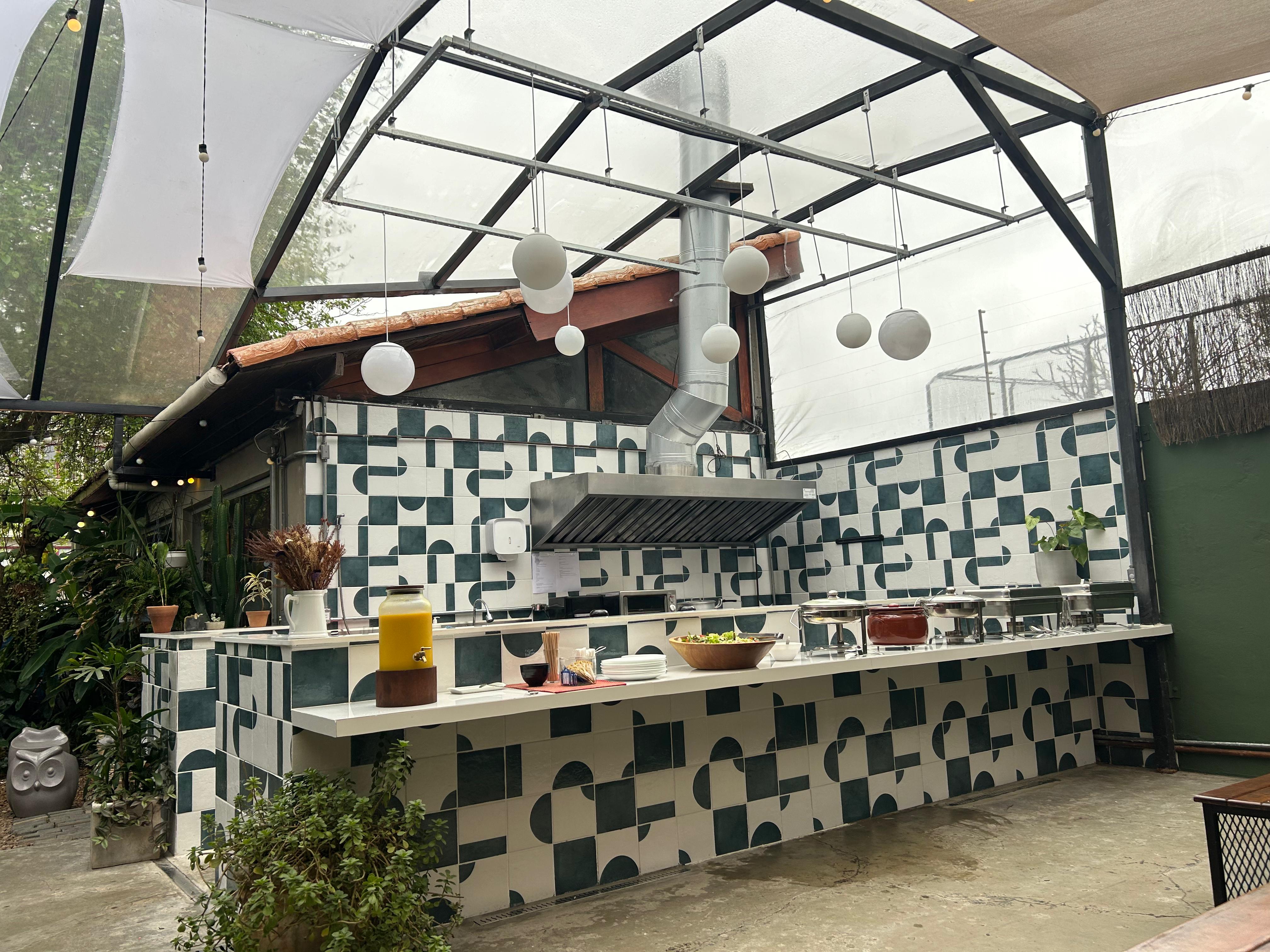- Pátio com sofás, mesas e com cobertura.
