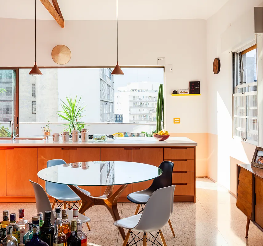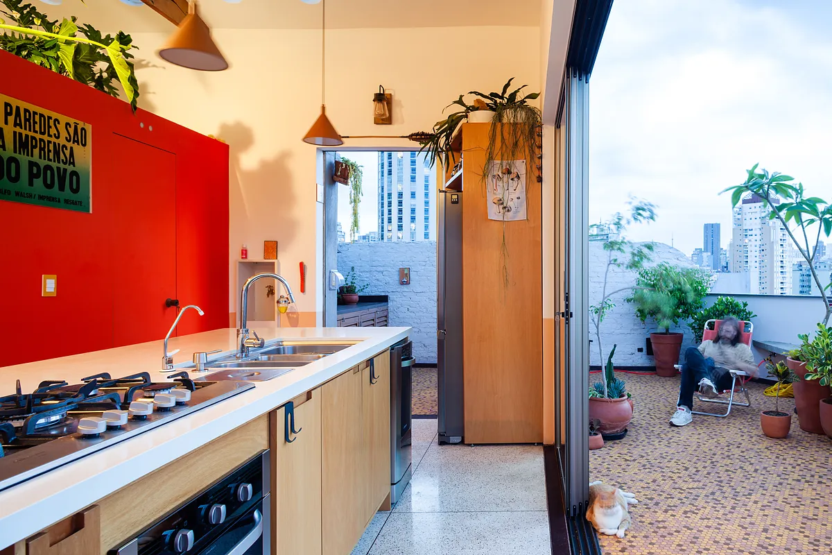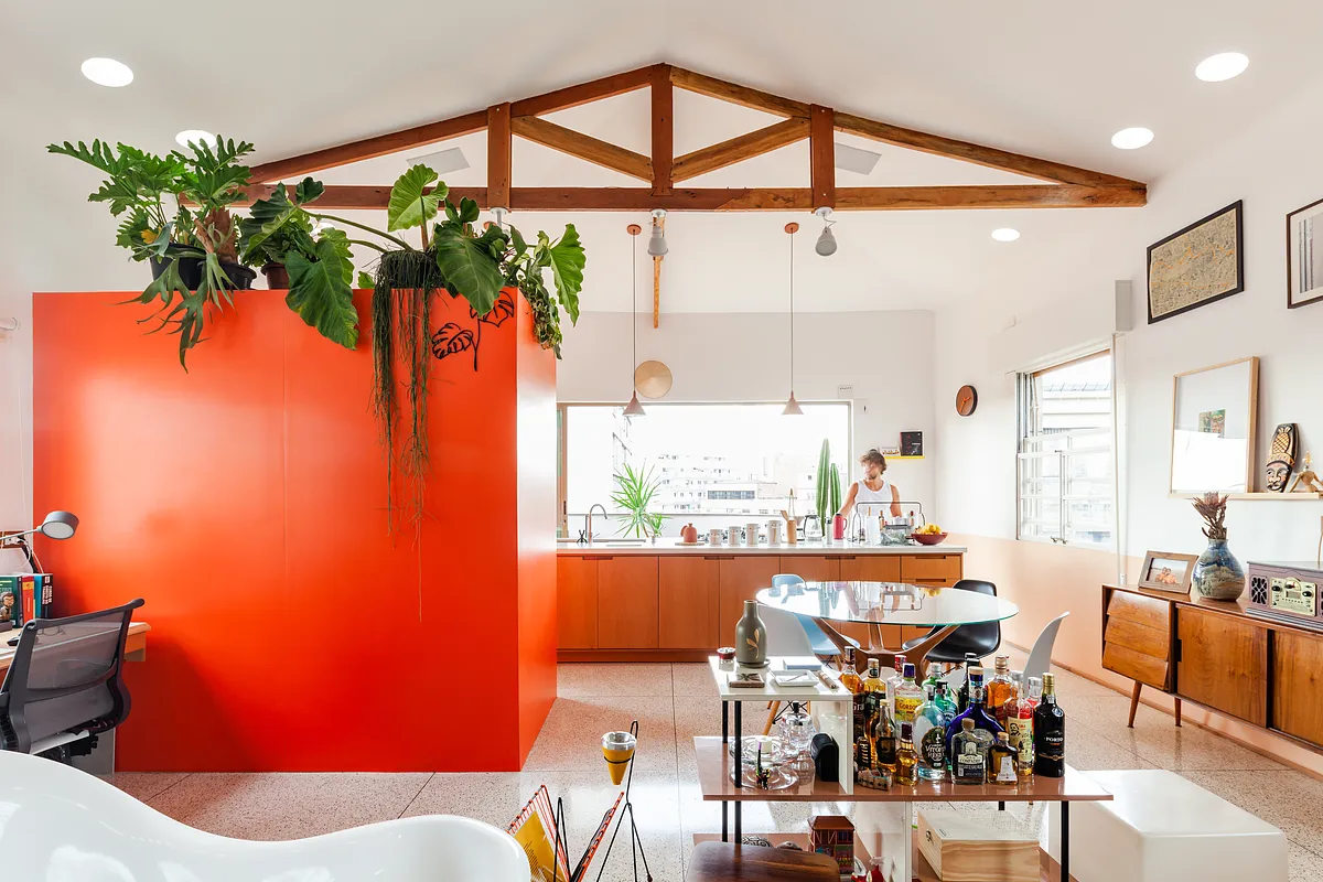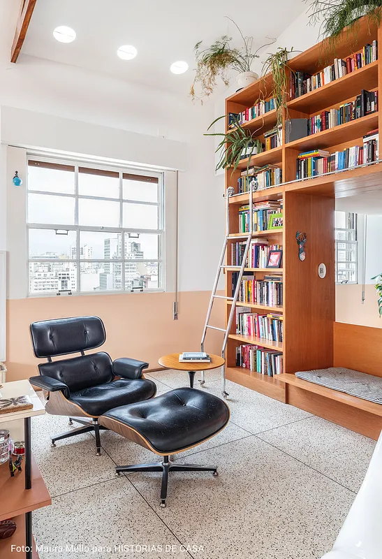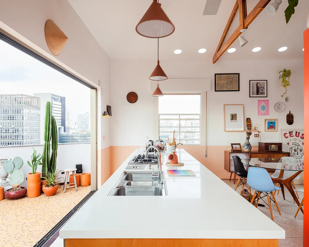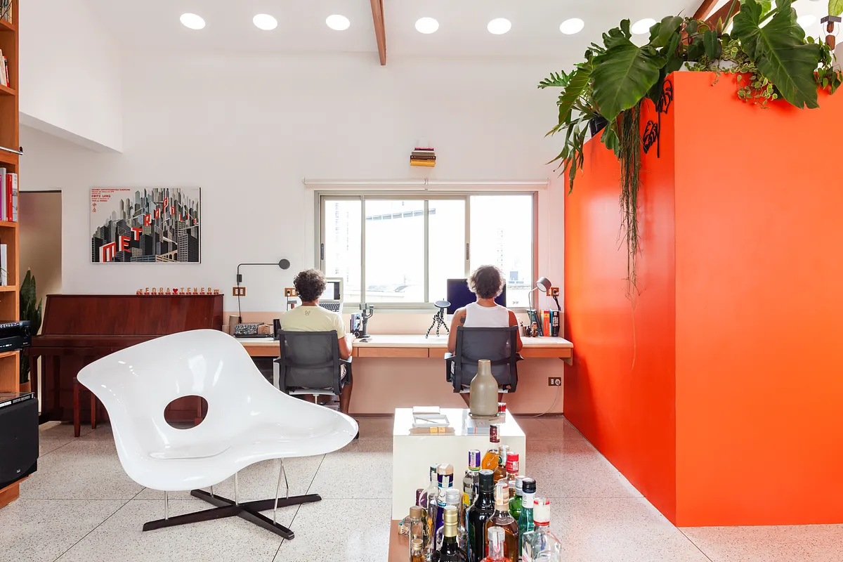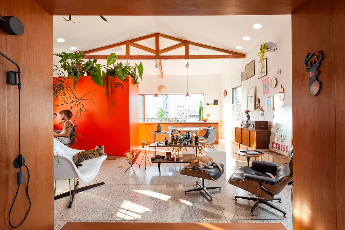 O pé direito super alto, o ambiente maior tem aproximadamente 5 metros o cume mais alto do telhado. Por ser um apartamento sem paredes praticamente, existe bastante recuo por todos os lados para enriquecer os ângulos. Os móveis são em sua maioria fáceis de locomover para mudança de configuração.