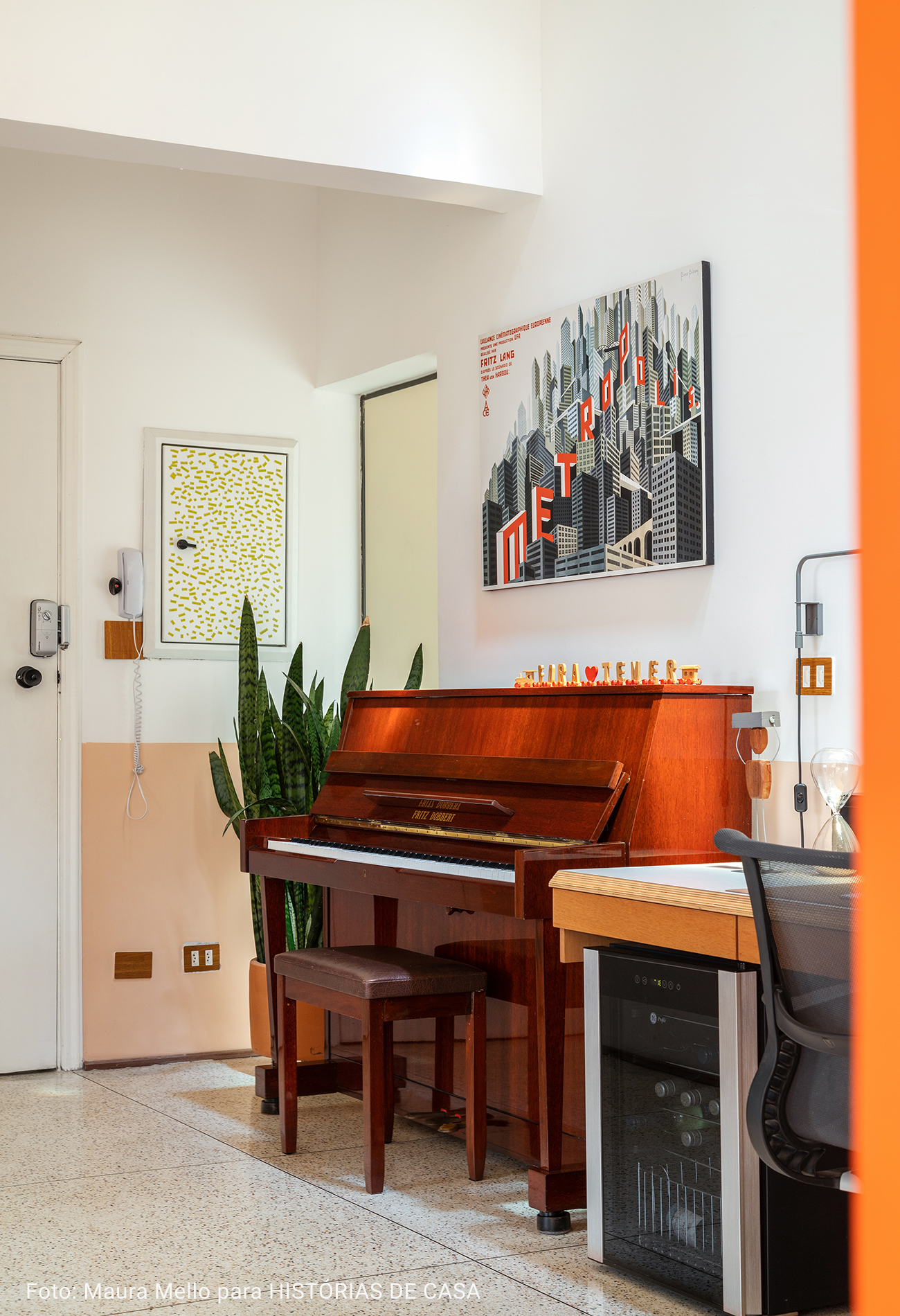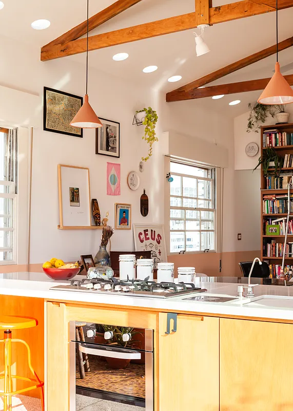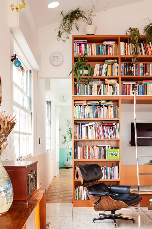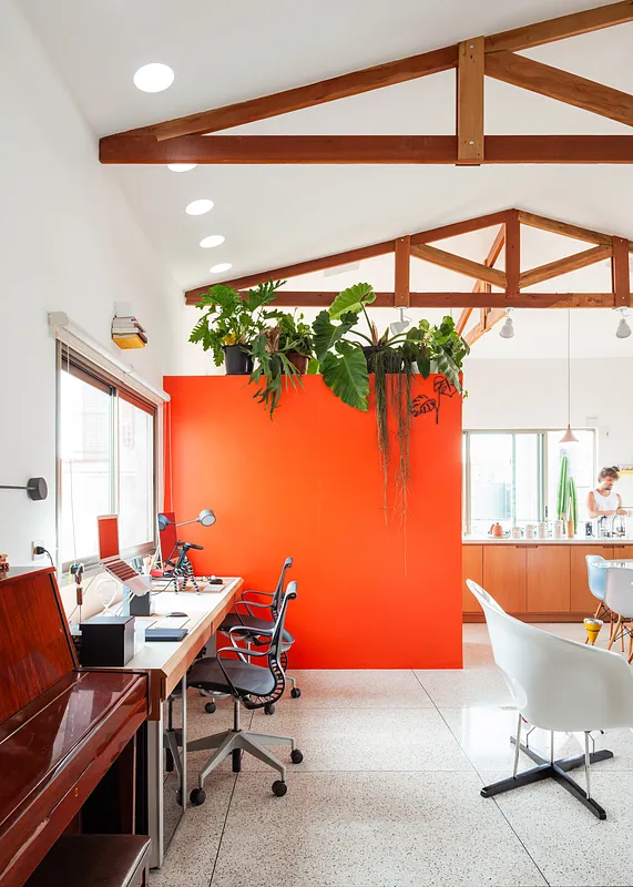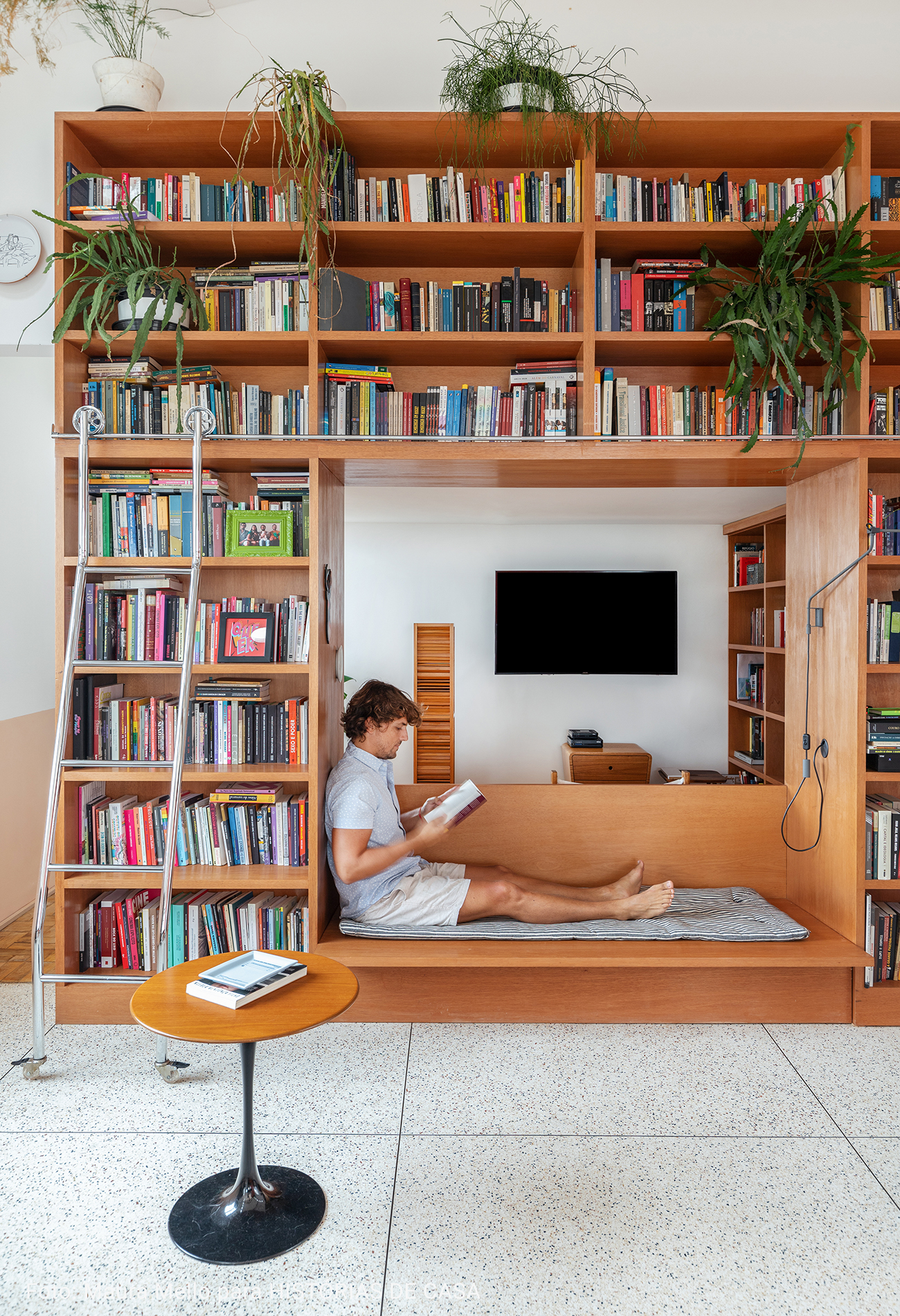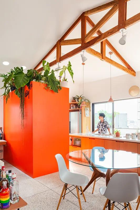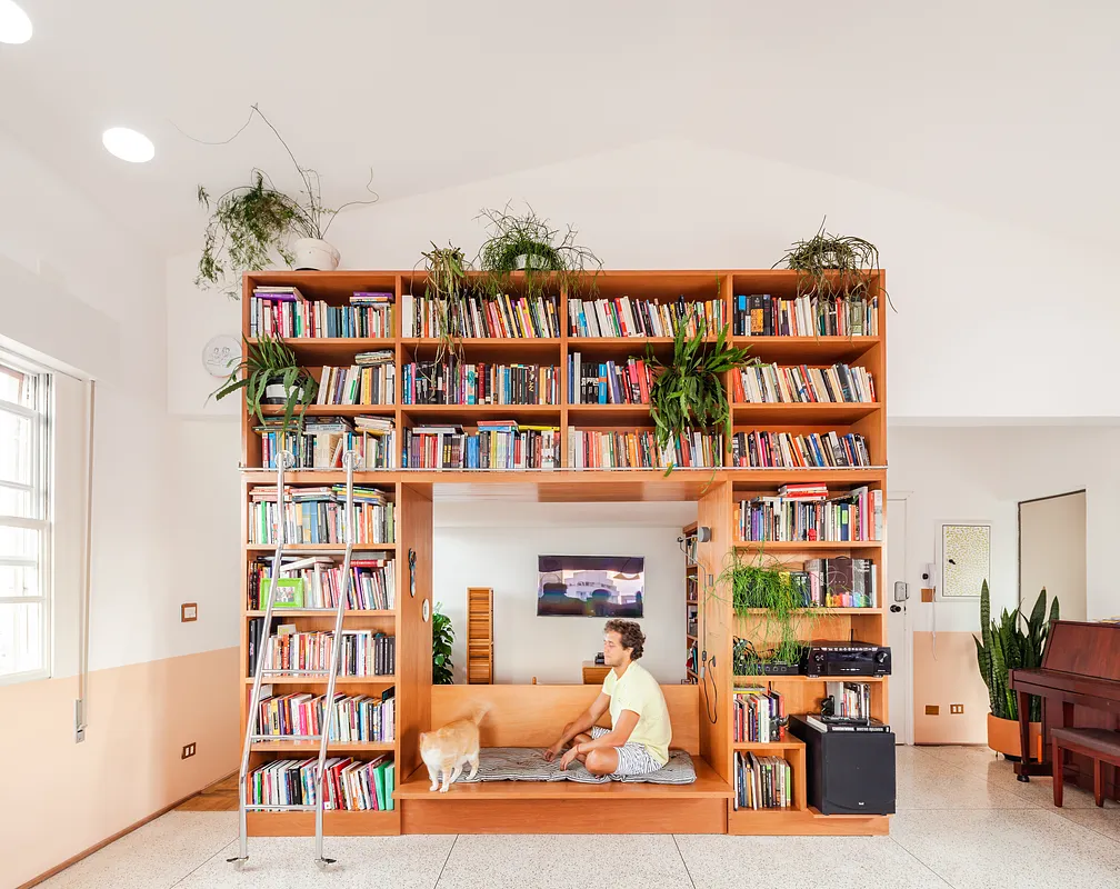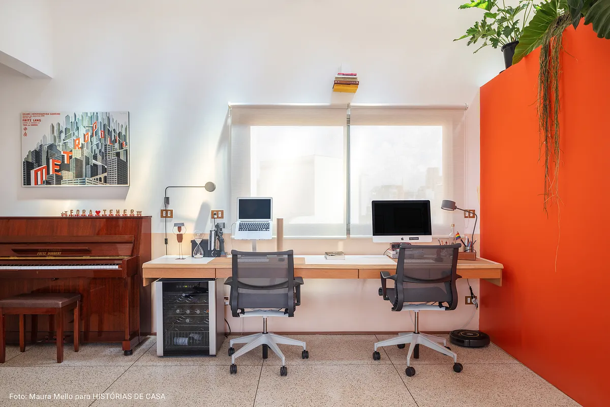 O pé direito super alto, o ambiente maior tem aproximadamente 5 metros o cume mais alto do telhado. Por ser um apartamento sem paredes praticamente, existe bastante recuo por todos os lados para enriquecer os ângulos. Os móveis são em sua maioria fáceis de locomover para mudança de configuração.