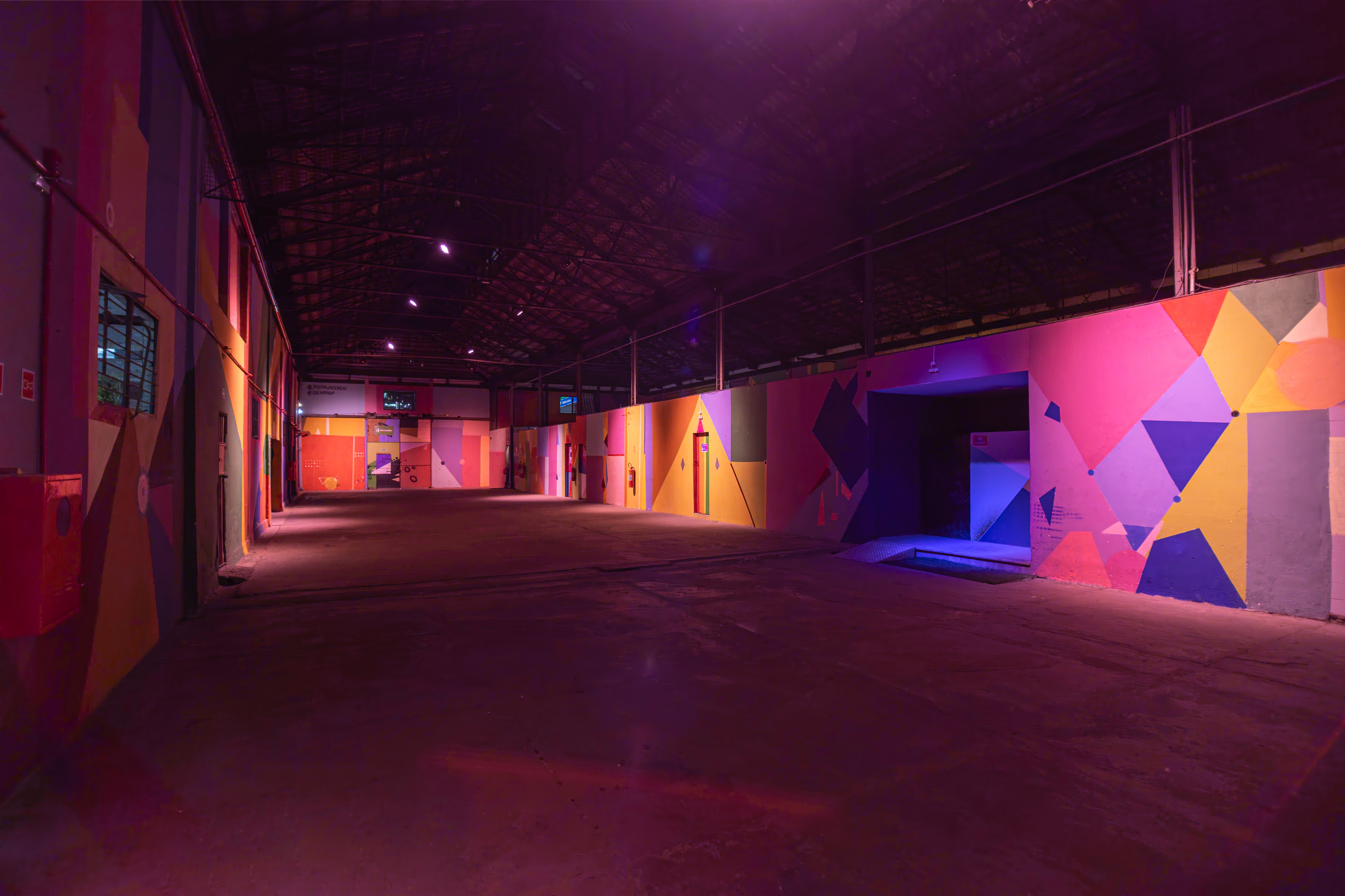 O galpão coberto se destaca por seu pé-direito alto, iluminação cênica e paredes grafitadas com design vibrante.