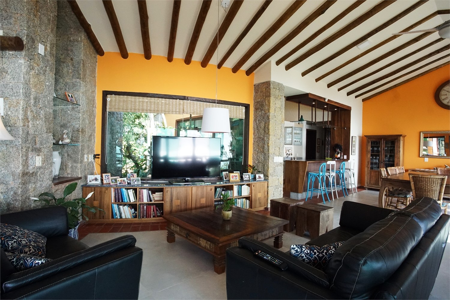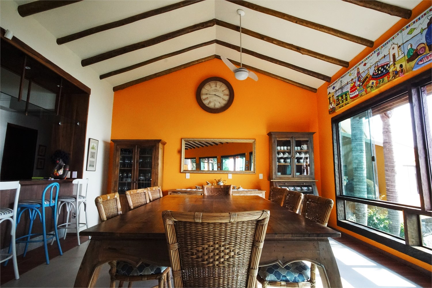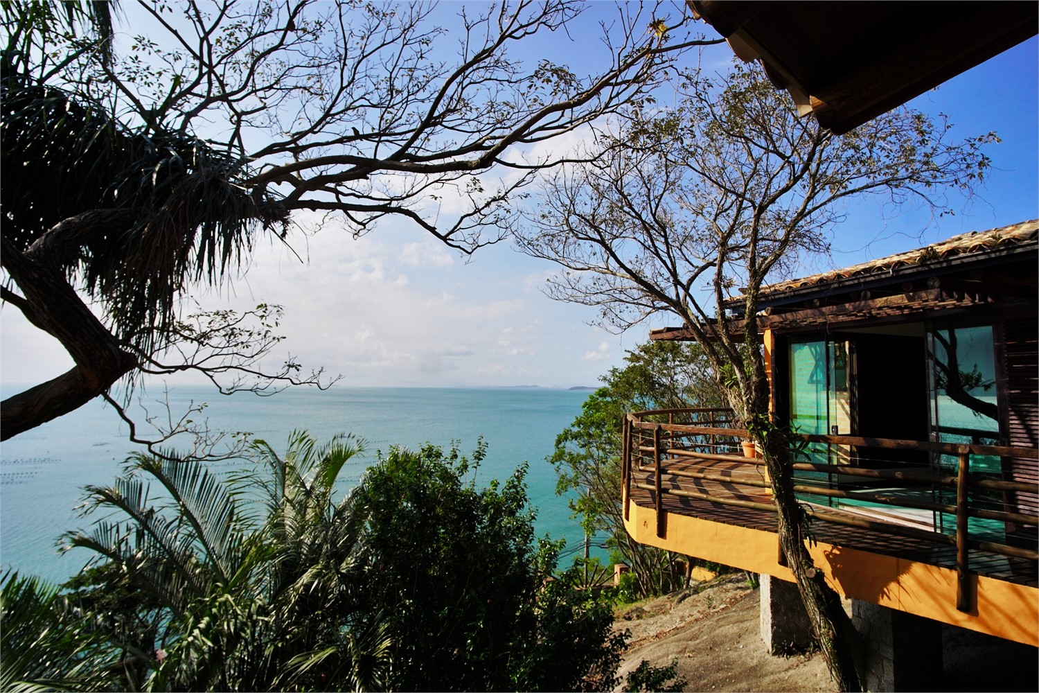 Andar superior: Espaçosa cozinha completa e equipada, sala de jantar com 8 lugares, sala de estar com lareira, Smart TV e wi-fi. Varanda com vista panorâmica do mar. Outras duas suítes com cama de casal e ar condicionado, sendo 1 suíte master com varanda privativa e vista para o mar.