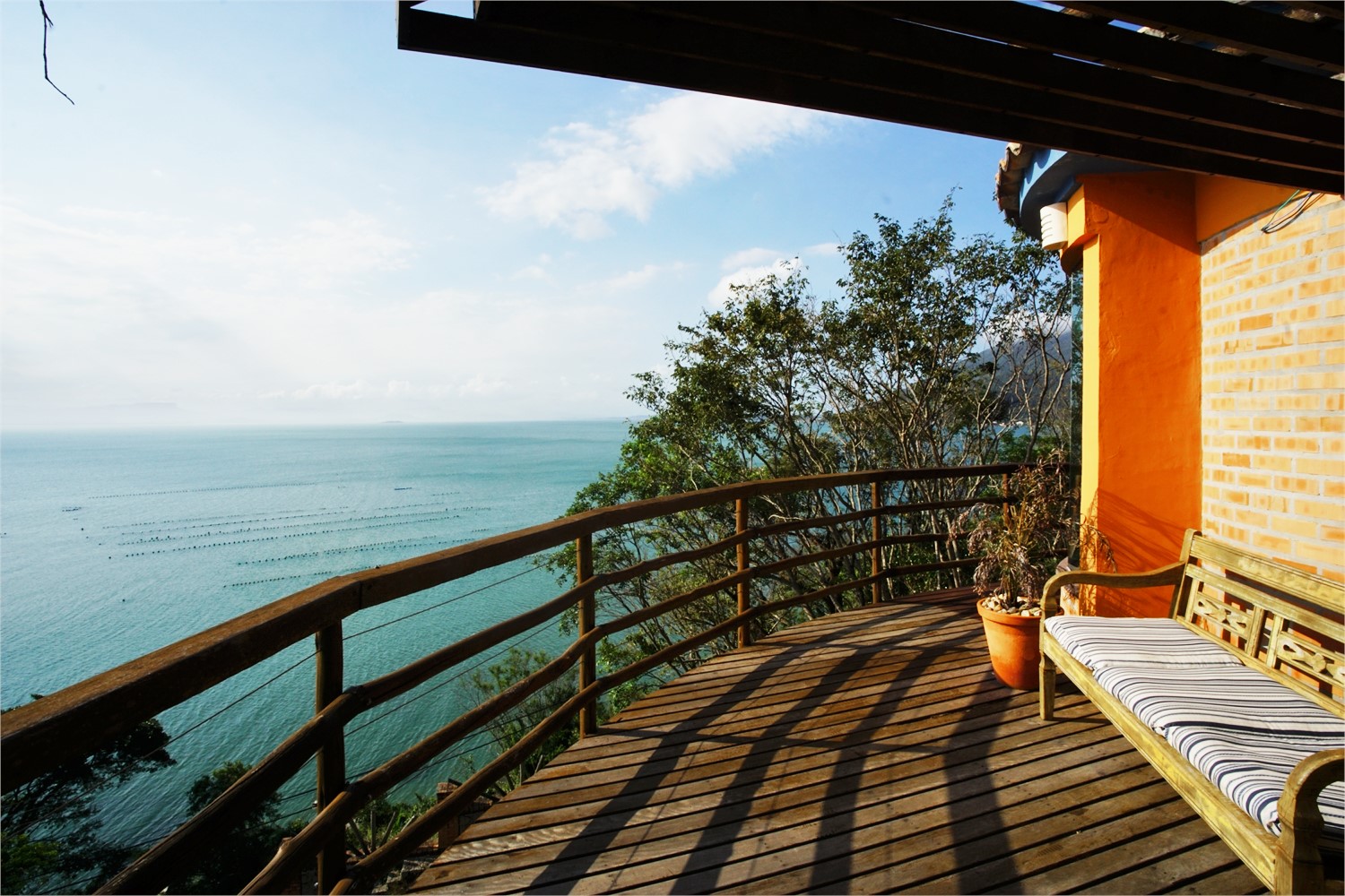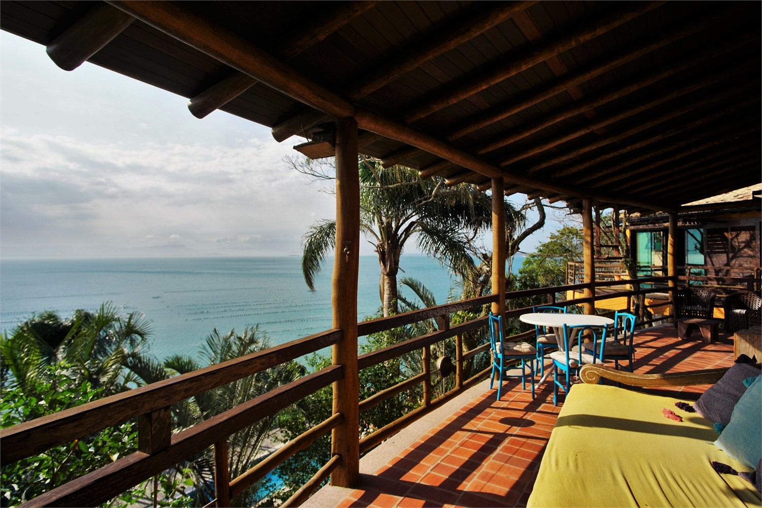 Andar superior com mais um quarto com ar condicionado e cama de casal, também com vista para o mar.