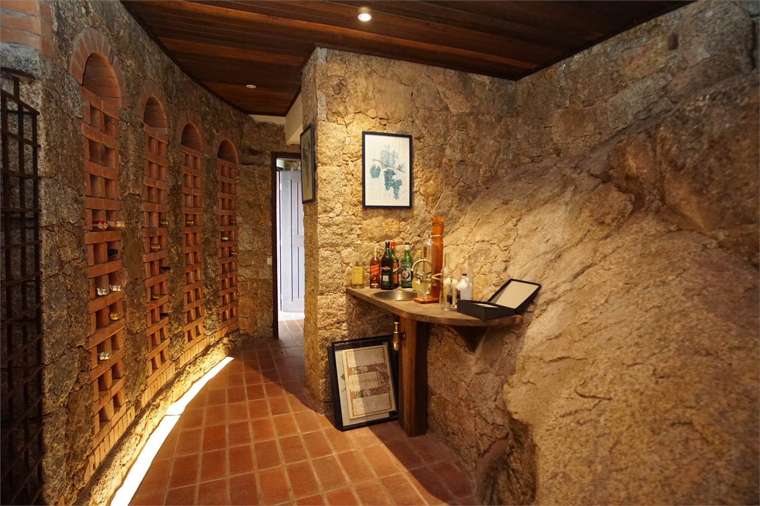 A casa possui 3 andares, sendo no primeiro: 1 suíte com cama de casal e ar condicionado, janela com vista para o mar. Espaço fechado com churrasqueira e uma incrível adega toda de pedra climatizada em temperatura ambiente.