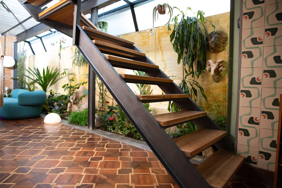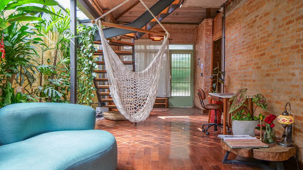 Na parte da frente do terreno, nossa casa complementa a experiência com um toque residencial e artístico. Com dois andares e uma arquitetura charmosa, a casa oferece ambientes bem iluminados e esteticamente variados — ideais para sessões de foto e vídeo, filmagens publicitárias, produções de cinema ou como base de produção.