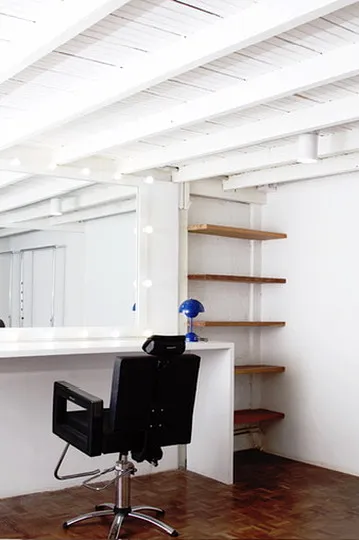 Espaço de beleza com lavatório, cadeiras e pia de cabeleireiro