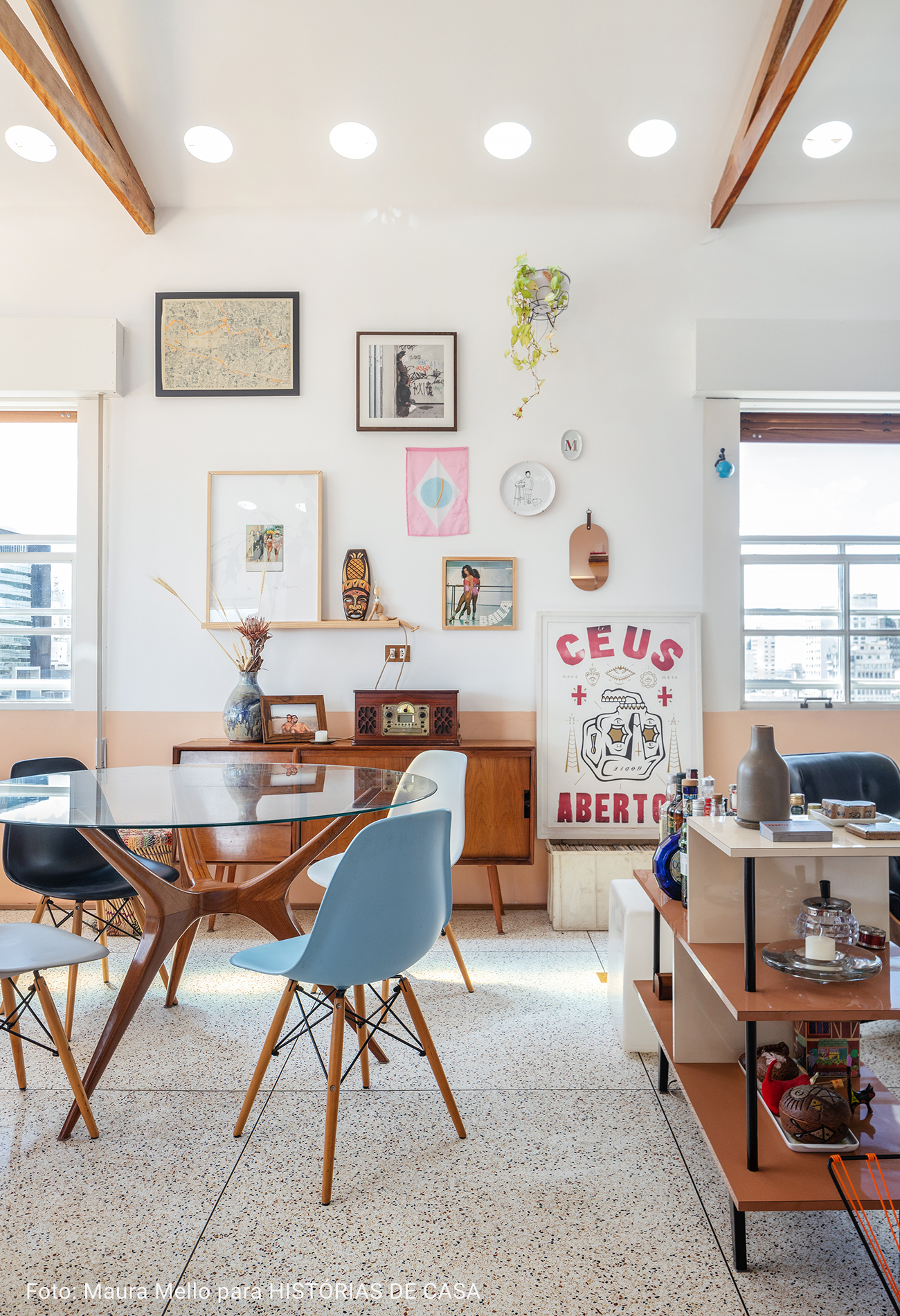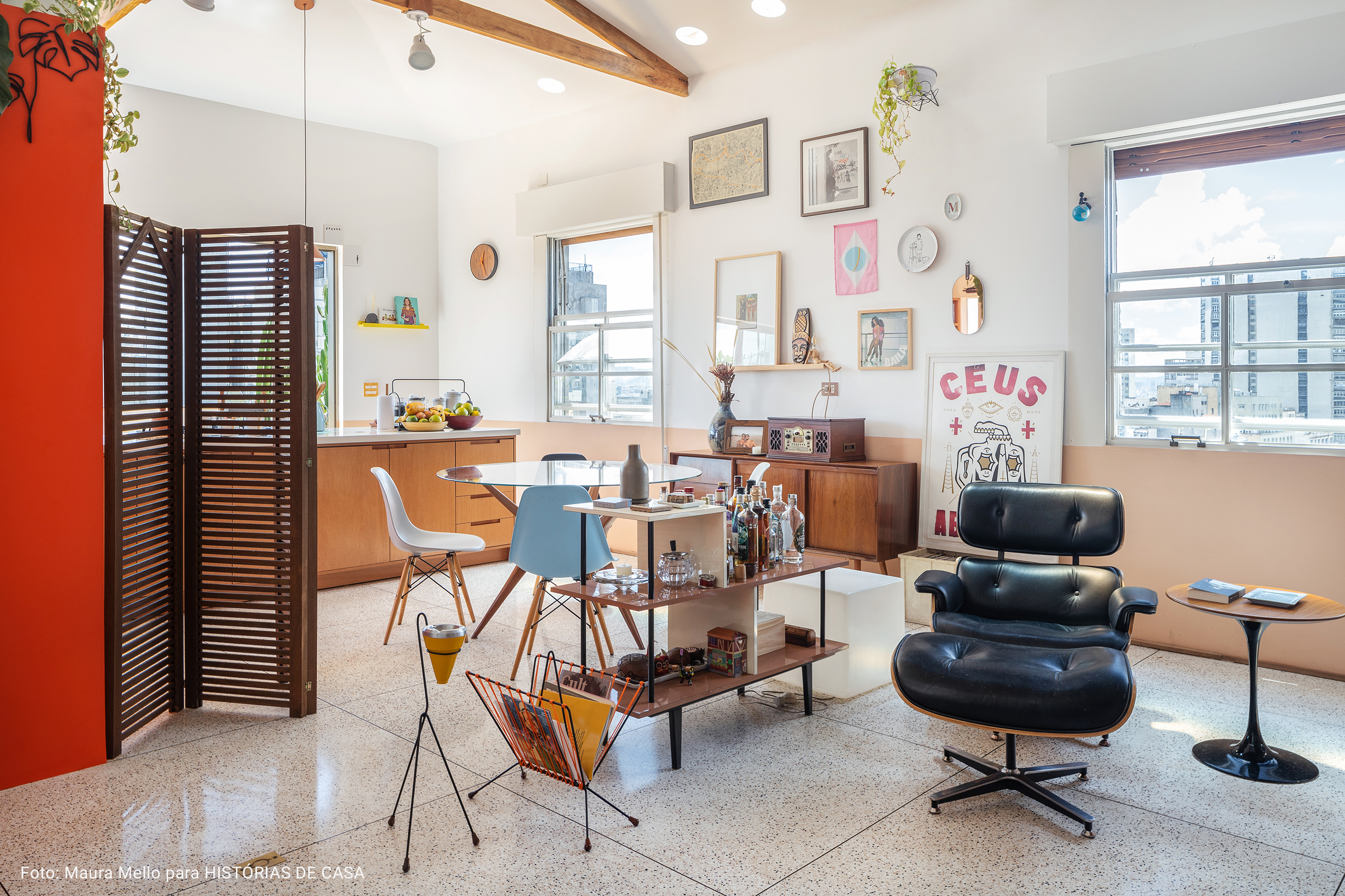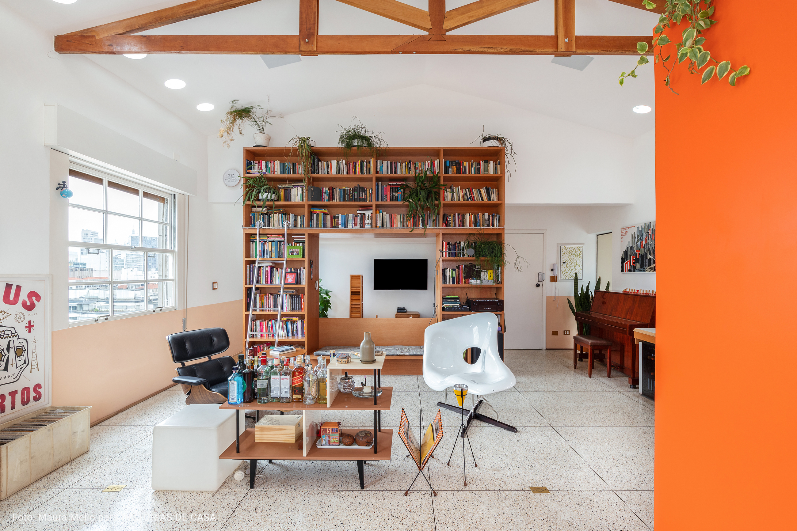 O pé direito super alto, o ambiente maior tem aproximadamente 5 metros o cume mais alto do telhado. Por ser um apartamento sem paredes praticamente, existe bastante recuo por todos os lados para enriquecer os ângulos. Os móveis são em sua maioria fáceis de locomover para mudança de configuração.
