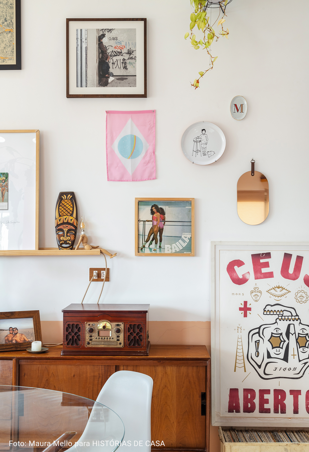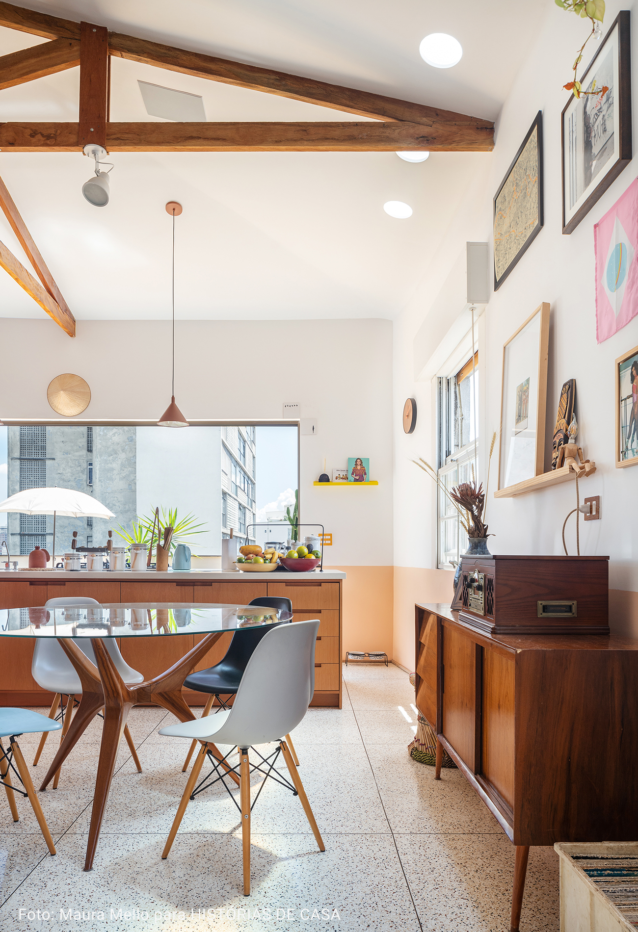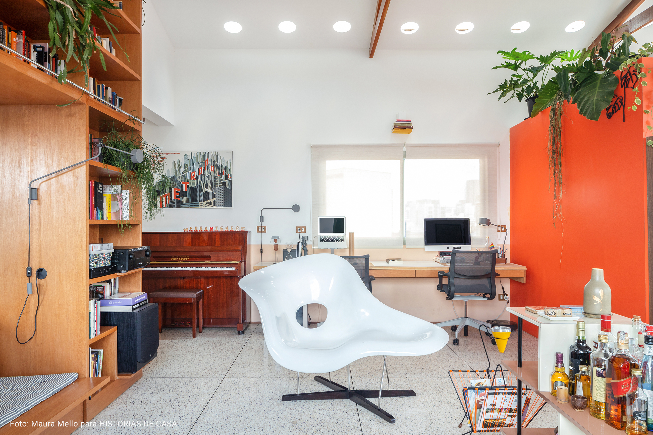 O pé direito super alto, o ambiente maior tem aproximadamente 5 metros o cume mais alto do telhado. Por ser um apartamento sem paredes praticamente, existe bastante recuo por todos os lados para enriquecer os ângulos. Os móveis são em sua maioria fáceis de locomover para mudança de configuração.