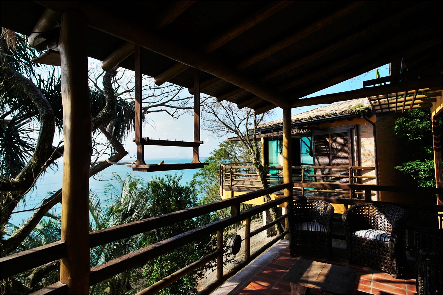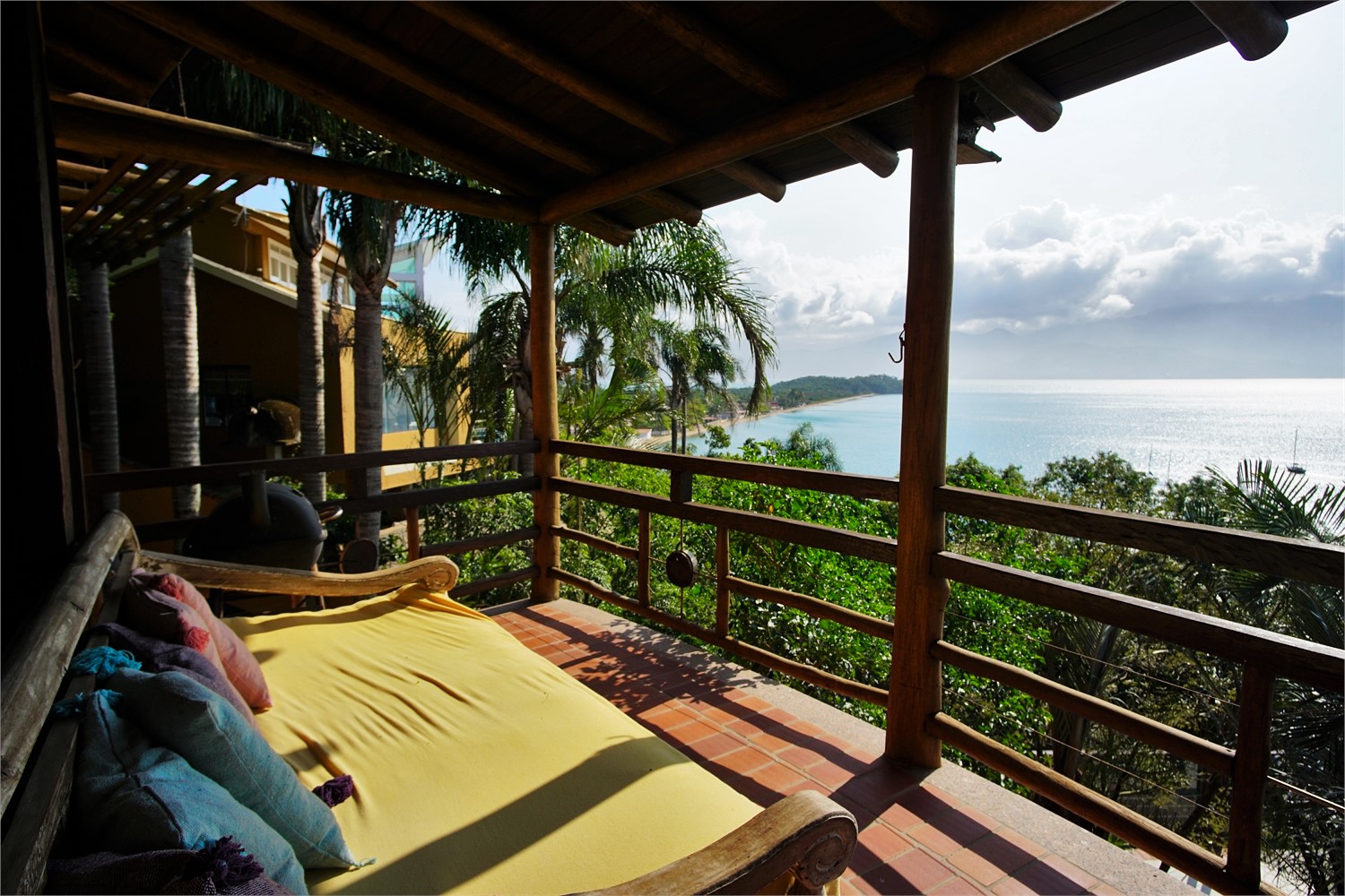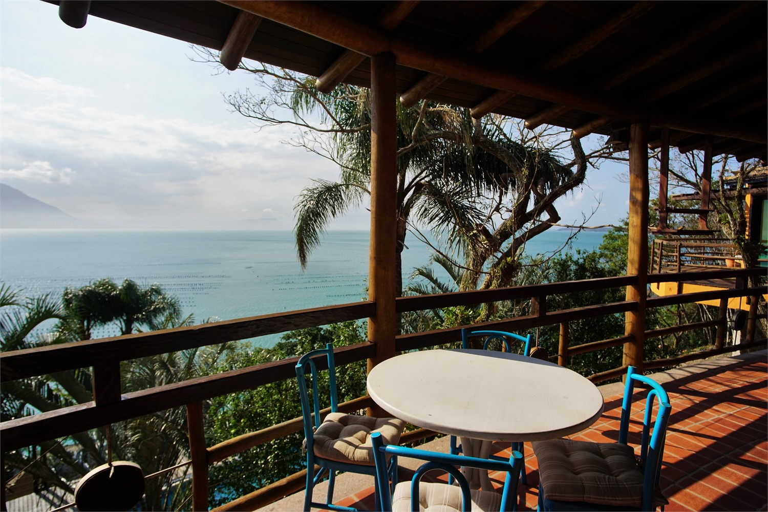 Andar superior com mais um quarto com ar condicionado e cama de casal, também com vista para o mar.