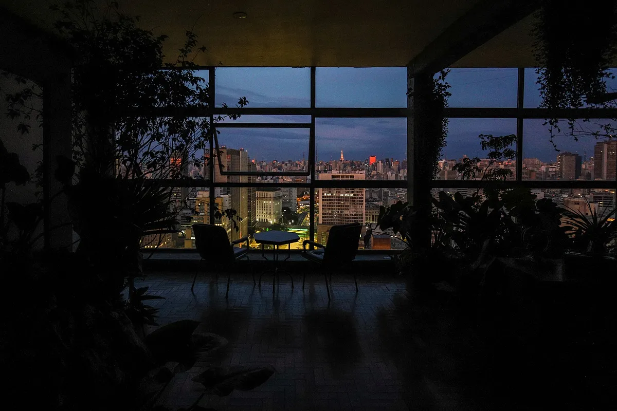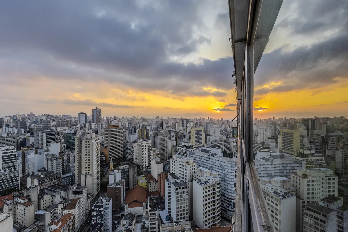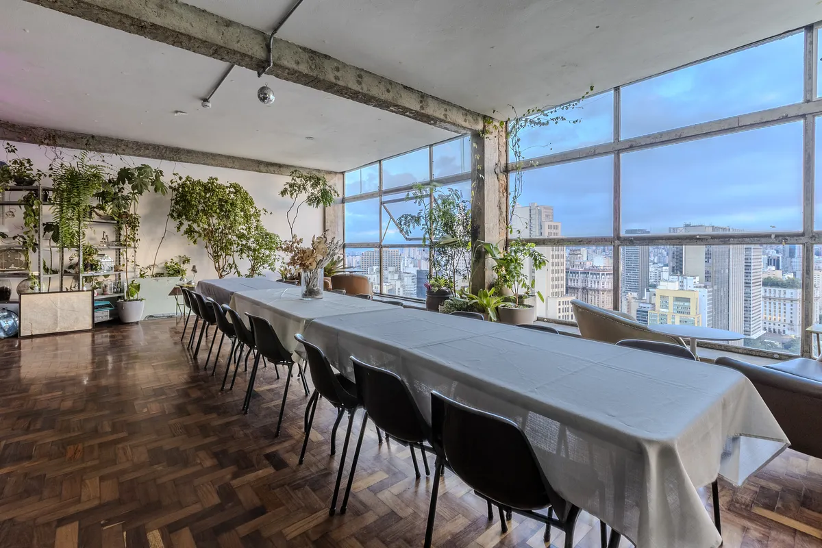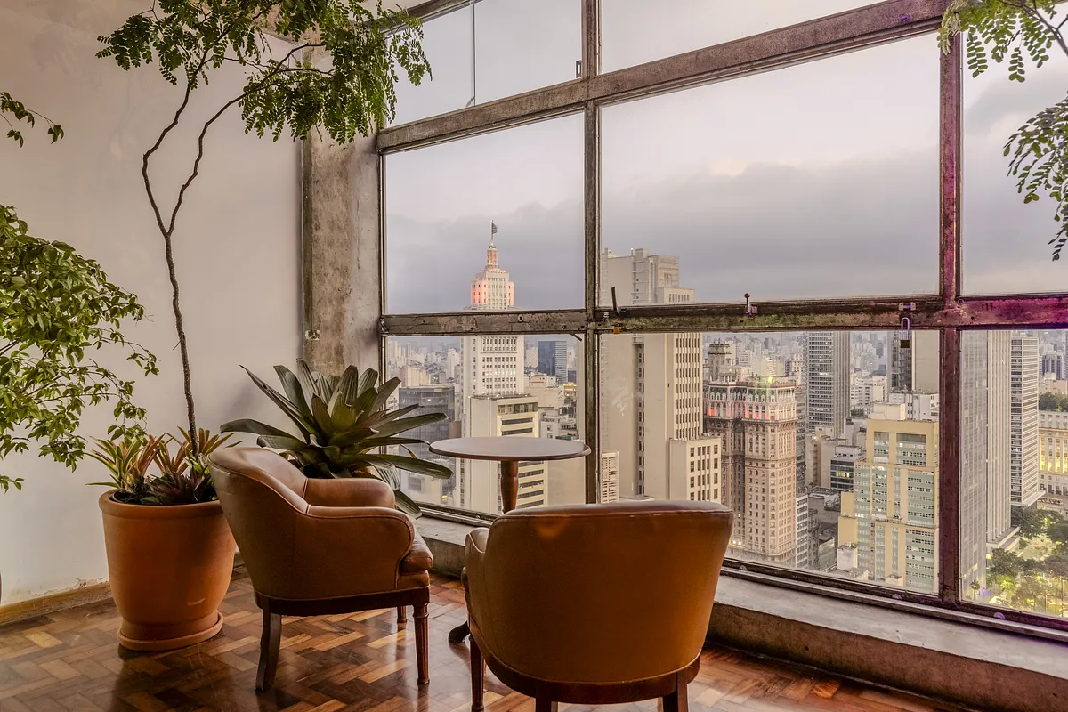 Nossa frente um panorama único sobre a skyline de SP. A sala fica acima do Vale de Anhangabaú, o coração pulsante da metrópole.
